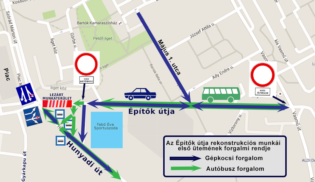 Az Építők útján a Vasmű út kereszteződésében Mindkét irányból behajtani tilos kivéve célforgalom tábla kerül kihelyezésre. Az Építők útján a Szórád M. út felé tartó személygépkocsi forgalom az Uszoda parkolóján keresztül tudnak majd a Szórád M. útra ráhajtani.