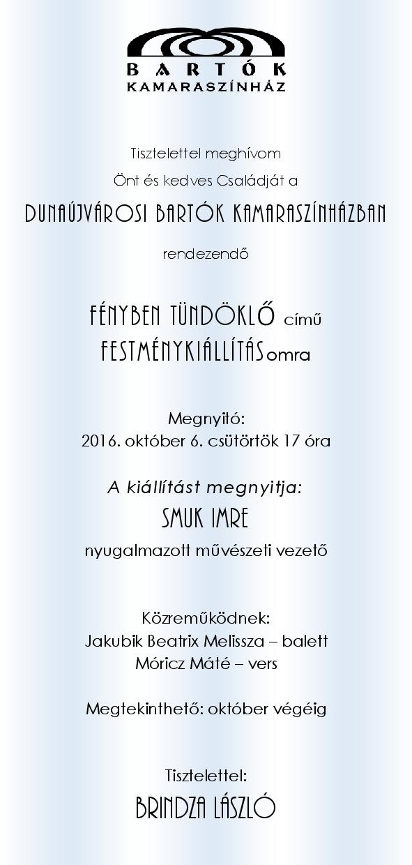 Szeretettel várnak minden kedves érdeklődőt a Bartók Kamaraszínházba, 2016. október 06-án csütörtökön 17 órakor Brindza László Fényben tündöklő című festménykiállításának megnyitó ünnepségére! A kiállítás október végéig megtekinthető!
