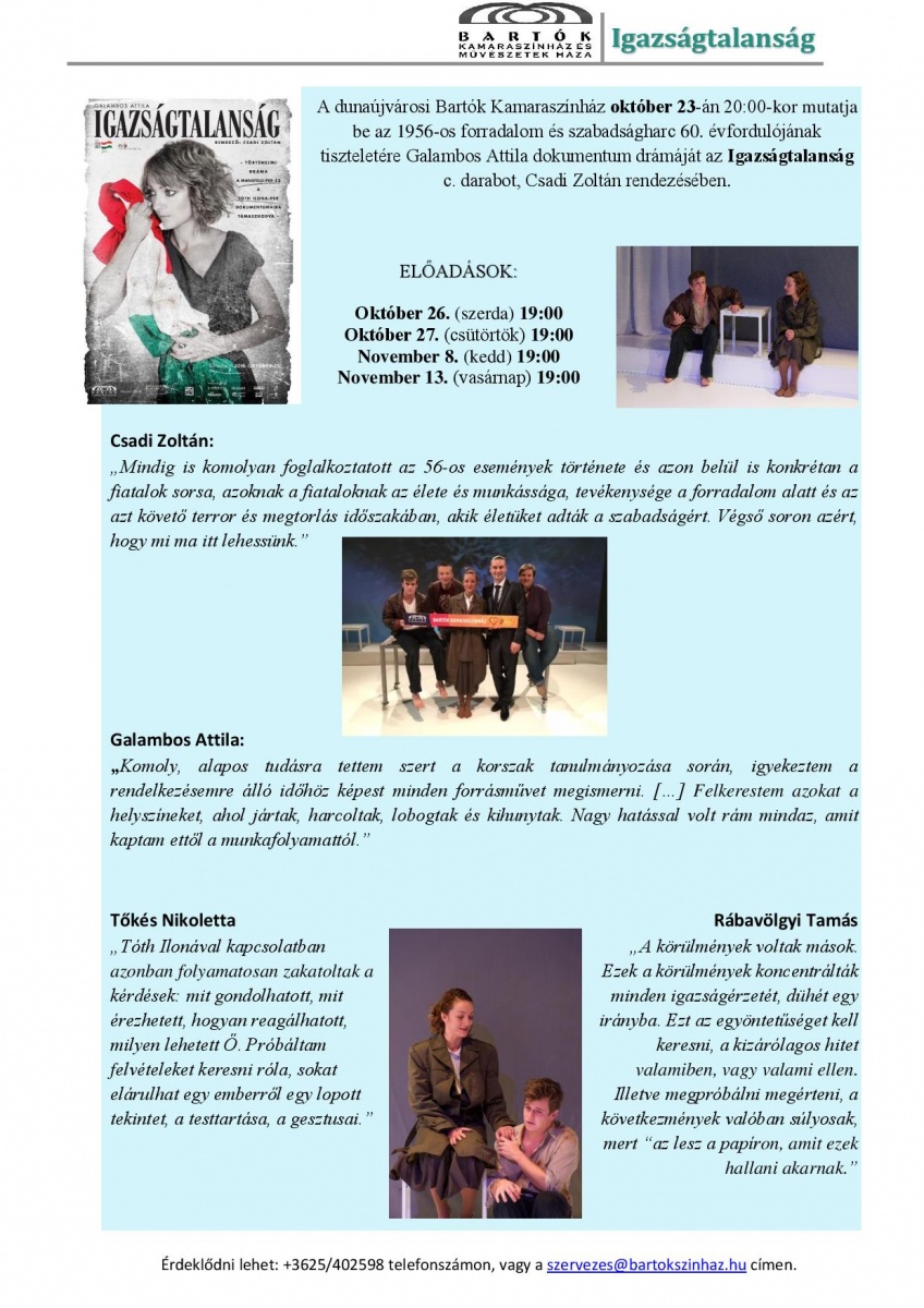 A Bartók Kamaraszínház az 1956-os forradalom és szabadságharc 60. évfordulójának tiszteletére 2016. október 23-án vasárnap 20 órától bemutatja Galambos Attila: Igazságtalanság című történelmi drámáját. A dráma a Mansfeld-per és a Tóth Ilona-per dokumentumaira támaszkodik. Rendező: Csadi Zoltán. További információkat a csatolt plakáton olvashatnak!