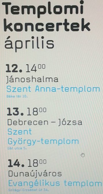 2018. április 14-én 18 órától a Budapesti Fesztiválzenekar ad koncertet, Bach kantáták hangzanak el az Evangélikus templomban. A belépés ingyenes, előzetes regisztráció javasolt a rendeles@bfz.hu e-mail címen. Bővebben: www.bfz.hu