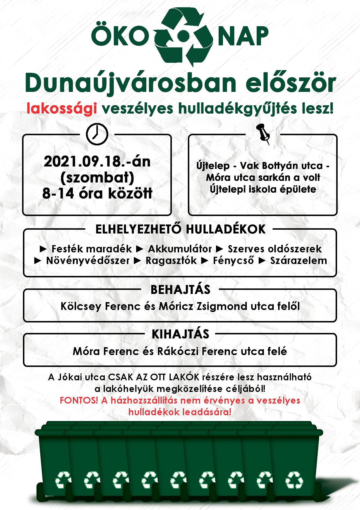 Nem is kell majd sokat várunk, hogy ismét élettel teljen meg a volt Újtelepi iskola udvara és környéke, ugyanis szeptember 18-án a már hagyományossá vált Öko-Napra vár a Városvédők Újtelepért Egyesület minden érdeklődőt. Idén megújult, még izgalmasabb programmal készülnek a szervezők, a fém – és elektromos hulladéklerakás mellett lakossági veszélyes hulladék lerakásra is lesz lehetőség, illetve a Magyar Vöröskereszttel közös szervezésben véradáson vehetünk részt, valamint a Dunaújvárosi Rendőrkapitányság jóvoltából kerékpárunkat regisztrálhatjuk (ún. BikeSafe akció): a nyilvántartásba vételük lehetővé teszi, hogy lopás esetén a jármű mielőbb visszakerüljön tulajdonosához. Mindezek mellett egzotikus rovar kiállítás, kézműves - és könyvvásár, valamint kürtőskalács várja a kilátogatókat!
