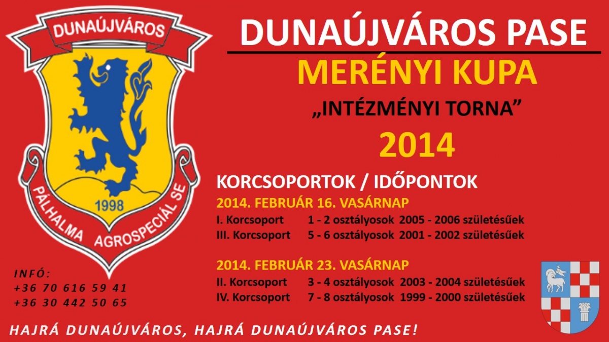 MERÉNYI KUPA „INTÉZMÉNYI LABDARÚGÓ KUPA - Dunaújváros Sportcsarnok 2014. február 16. és 23. A verseny célja: a dunaújvárosi és a környékbeli települések általános iskoláinak versenyeztetése, a labdarúgás népszerűsítése, labdarúgást kedvelő és az MLSZ Bozsik Intézményi programban résztvevő gyermekek részére is versenylehetőség biztosítása, a tehetséges gyerekek kiválasztása, a sportbaráti kapcsolatok megteremtése, szélesítése, legjobbak díjazása, elismerése. Részletekért kattintson a tovább ikonra.