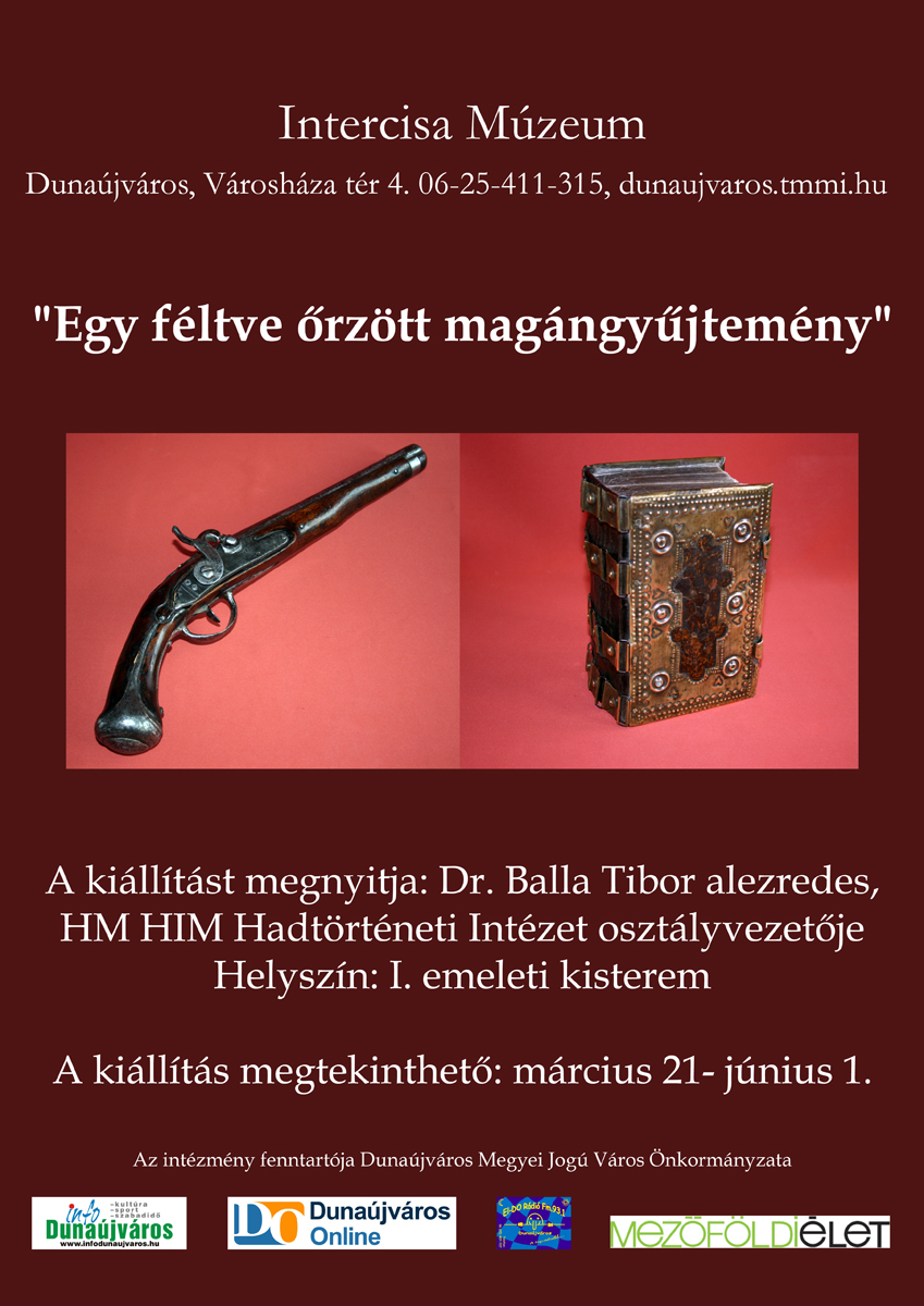 Az Intercisa Múzeum szeretettel vár minden érdeklődőt "Egy féltve őrzött magángyűjtemény" című kiállítására! Megnyitó: 2014. március 21., péntek 17.00 óra Megnyitja: Dr. Balla Tibor alezredes, HM HIM Hadtörténeti Intézet osztályvezetője Helyszín: Intercisa Múzeum. I. emelet (kisterem) 2400 Dunaújváros, Városháza tér 4. Megtekinthető: 2014. március 21. – június 01. Azonos időben: Aranyos Sándor baracsi kézműves mester, fegyverkovács saját készítésű fegyverei, "A munkámra igényes, magyarságomra büszke mesterember vagyok." c. kiállítás megnyitásával Helyszín: I. emeleti kisterem Előzetes egyeztetés alapján előadást tart minden héten szerdán délelőtt 10 órától (kb. 1 óra időtartamban). Pentelei Kézműves Egyesület tagja A kiállítás megtekinthető: március 21 - április 20. Bővebb felvilágosítás kérhető a 25/411-315 és 25/408-970 telefonszámokon Mail: intercisamuz@gmail.com Web: www.dunaujvaros.tmmi.hu