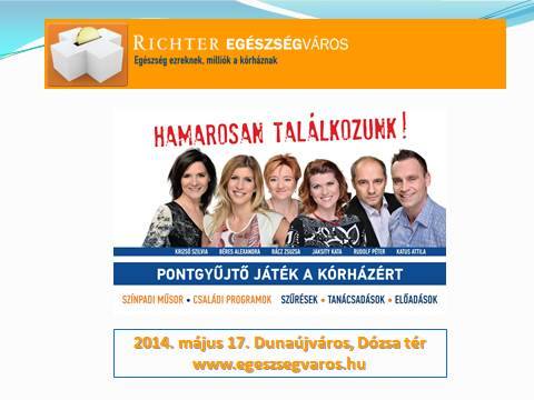 A Richter Gedeon cég Egészségváros programsorozata elérkezett városunkba is. A rendezvénysorozat alapvető célja az egyéni felelősség és szerepvállalás tudatosítása az egészségi állapot alakulásában. 2014. május 17-én 9,30 órától a szabadtéri családi egészségprogramot szervez a Richter Gedeon gyógyszercég a dunaújvárosi Dózsa mozi téren. A jótékonysággal egybekötött ingyenes egészségügyi szűrések mellett, színpadi programokkal, egészséggel kapcsolatos előadásokkal, tanácsadással, családi program lehetőségekkel színesített rendezvény várja az ide látogató érdeklődőket.