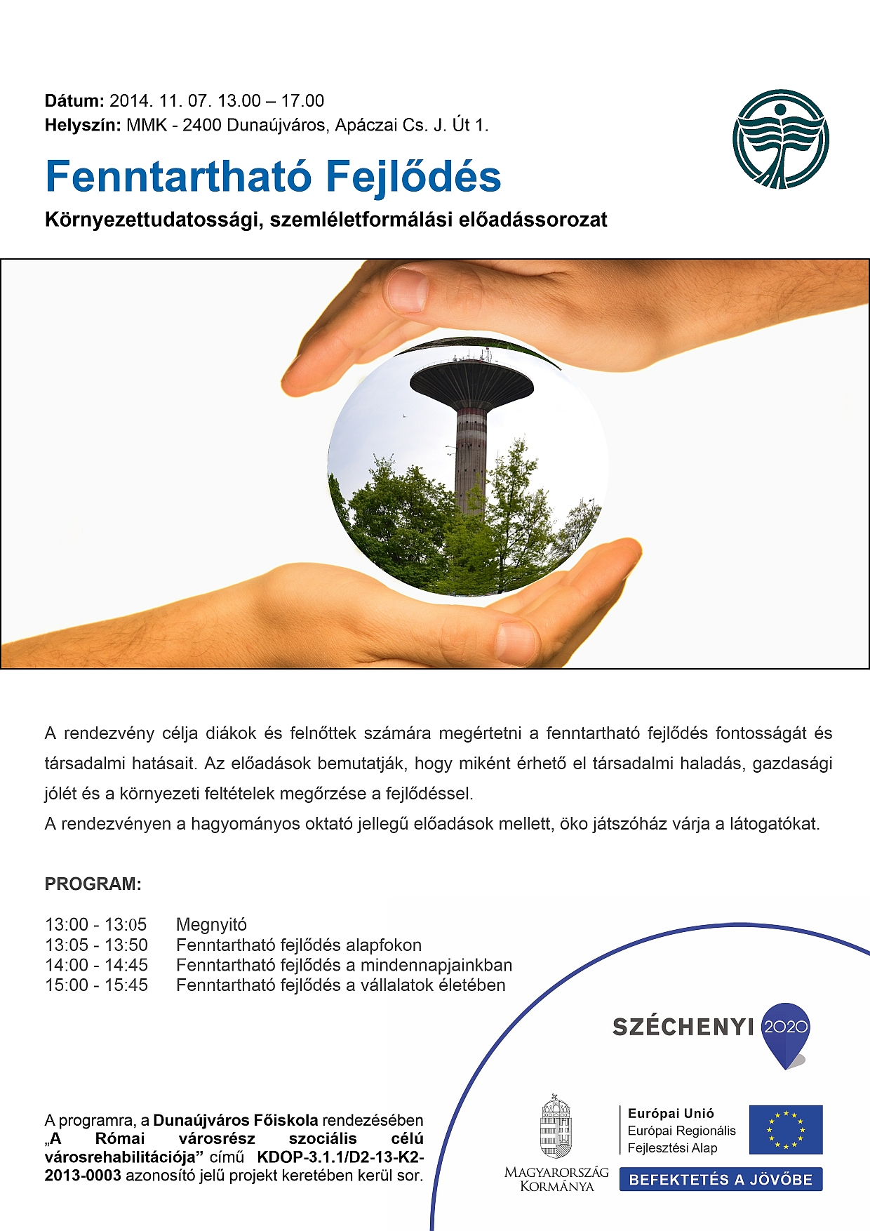 A Dunaújvárosi Főiskola rendezésében környezettudatossági, szemléletformálási előadássorozatra kerül sor. A program a Római városrész szociális célú városrehabilitációja című KDOP-3.1.1/D2-13-k2-2013-0003 számú projektben megvalósuló SOFT elem. Az előadássorozat első tematikus napjára 2014. november 7-én 13 órai kezdettel kerül sor. Témája a fenntartható fejlődés. A rendezvényen három előadás hangzik el az érdeklődők részére, amelyek a téma fontosságára világítanak rá. Ezekkel párhuzamosan interaktív eszközök segítségével kaphatnak szórakoztató formában újabb ismereteket az előadáson elhangzottakról a diákok és felnőttek egyaránt.