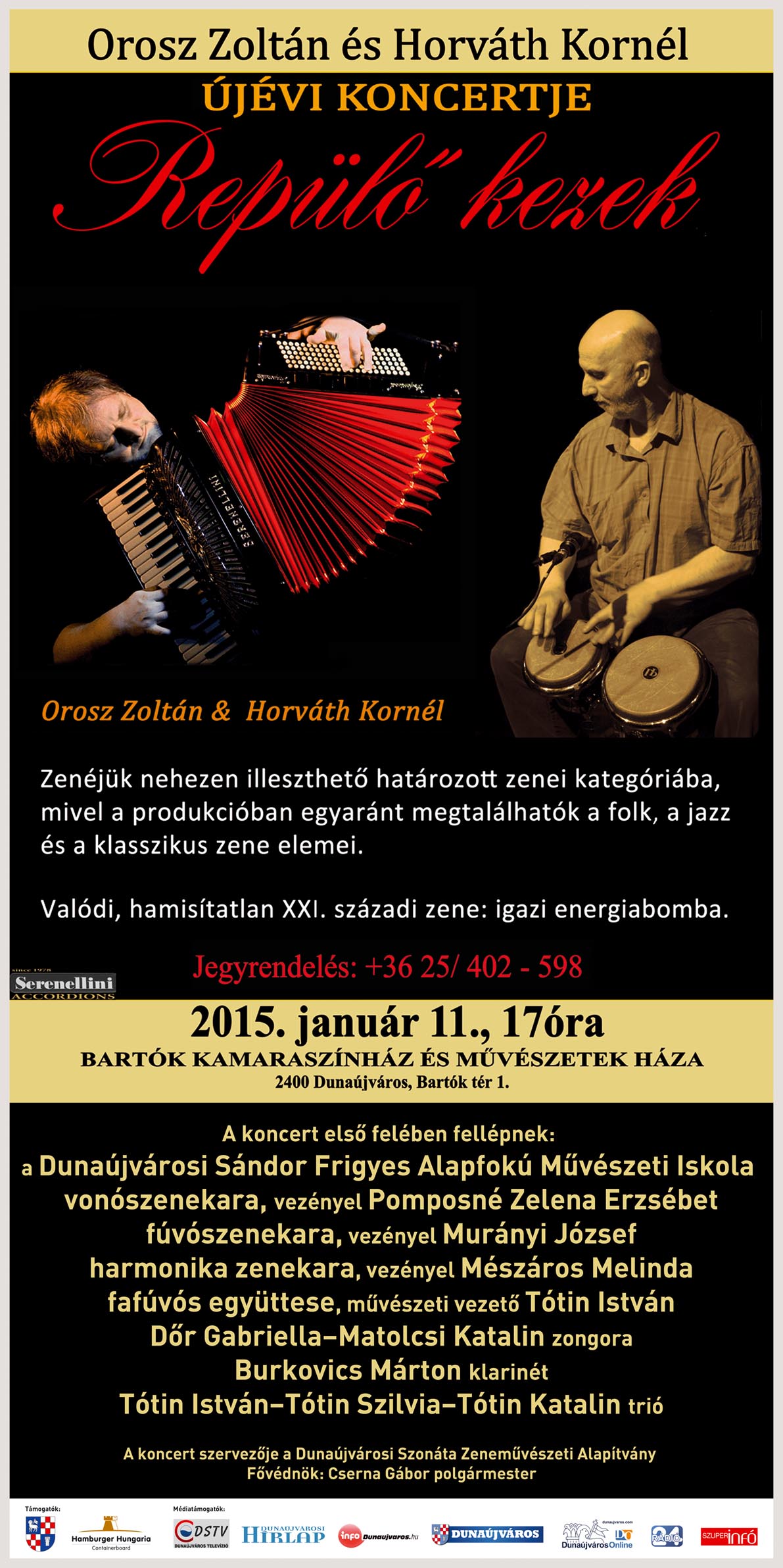 2015. január 11-én Orosz Zoltán és Horváth Kornél "Repülő kezek" koncertjére várják a közönséget a Bartók Kamaraszínház és Művészetek Házába! Részleteket a csatolt plakáton olvashatnak!